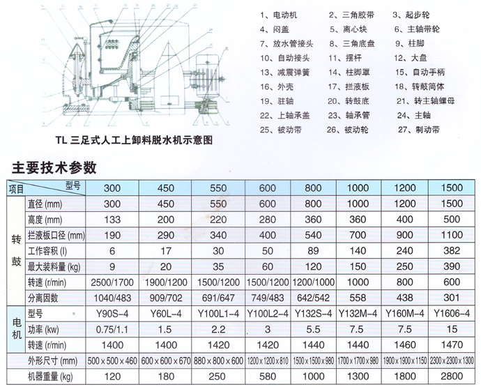 TL型三足式工業脫水機為人工上部卸料、間歇操作的過濾脫水機。